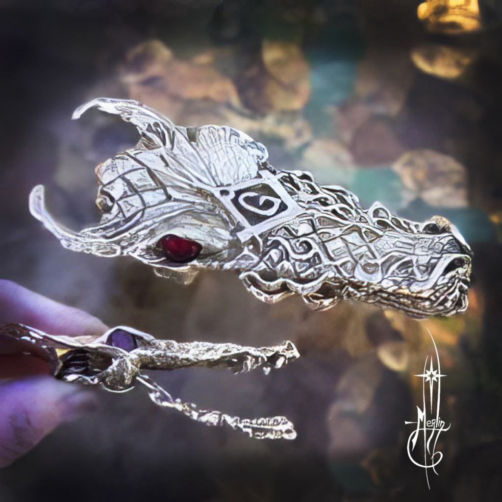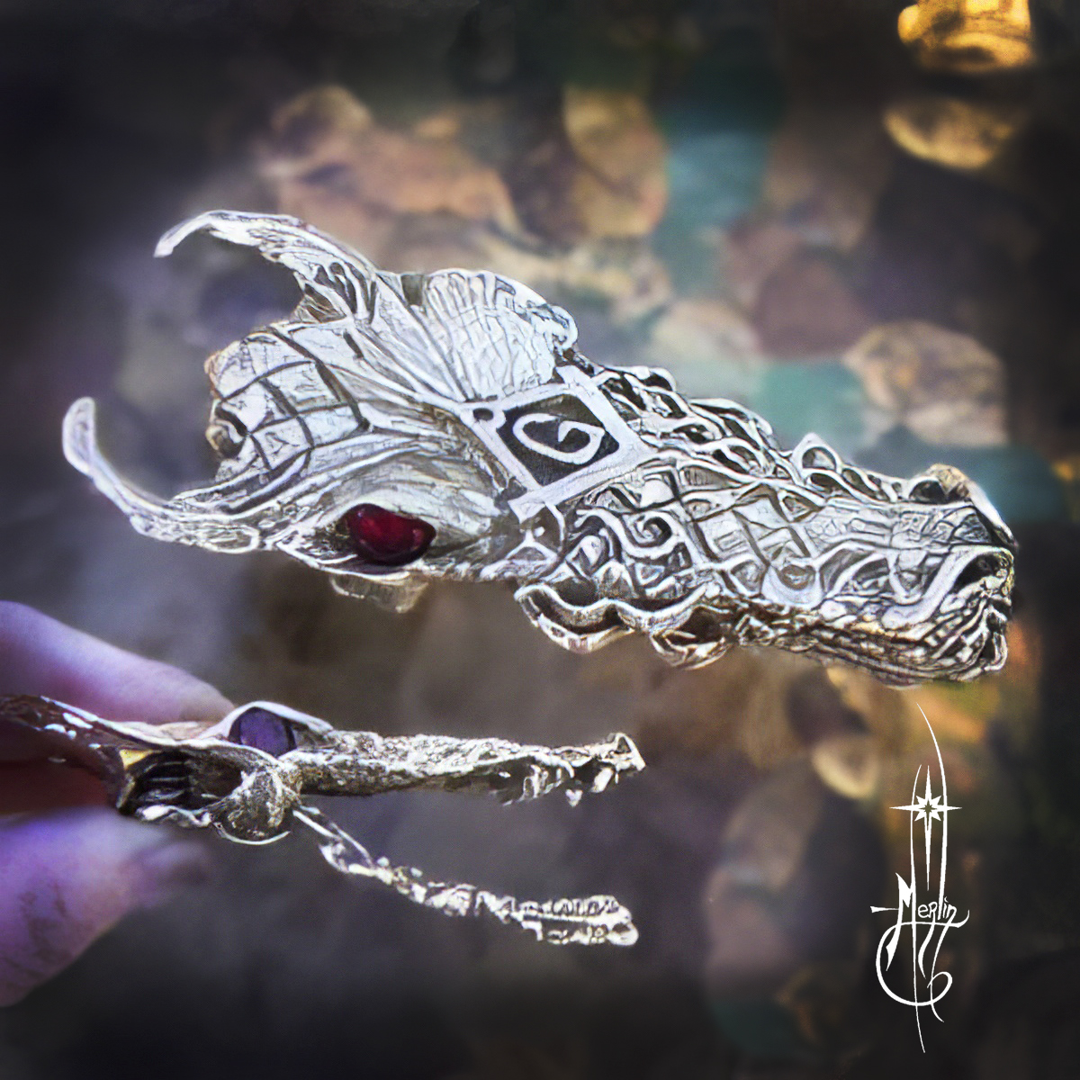Synthetic rubies for the eyes and the teeth touched with red enamel. Designed and hand carved by Kirk McLaren of Amulets by Merlin