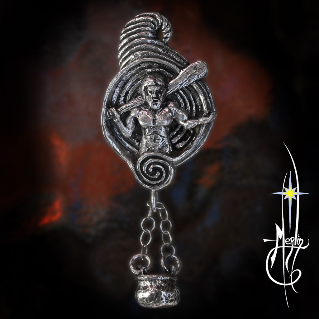 Combining these ideas into a single amulet, I placed Dagda in the center, shouldering his Great Club and with the other hand is held palm up as an offering of assisted and good Will. His Caldron is hung beneath, suspended from a spiral of “becoming”. Tendrils emanate into a cornucopia, engulfing the figure and creating a Hood around him. The spiral continues into the distance suggesting eternity.